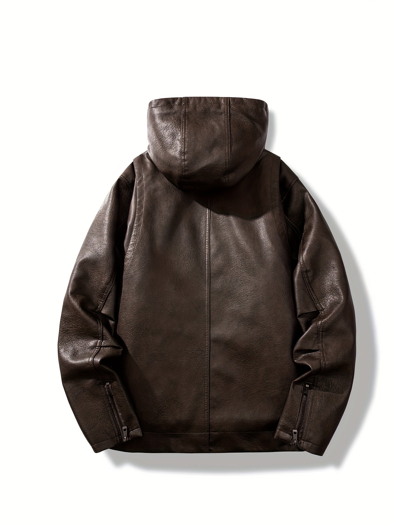 Men's Leather Jacket Windproof & High Quality Winter Coat, Full-Zip Hooded Collar.